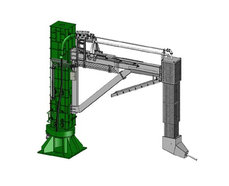 电炉出钢后,可以执行喷补修复作业,此时悬臂式电炉自动修补机的机械手开始动作。首先,补炉机械手的横臂从待机位置升起, 并旋转至电炉中心位置停止,横臂下降至喷枪枪头对准喷补部位,启动“喷料按钮”,开始对电炉破损部位进行喷射。喷枪枪头不但可以 360 度自由旋转而且可以俯仰 30 度,以便于调整喷射角度。伸缩臂可伸缩以调整枪头距离炉墙的喷射距离,更好保证喷补效果。本设备既可以进行圆周喷补,又可以对炉壁损坏严重的部分用点射的方法进行局部喷补,从而避免浪费大量补炉料,节约增效。