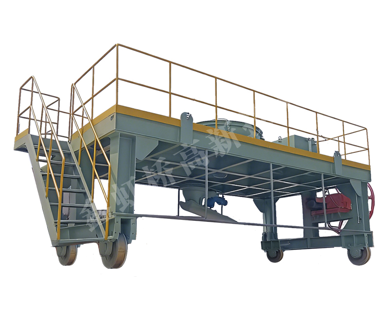 搅拌平台台车由搅拌台车车架、车轮组、框架、传动装置(减速电机)、及电缆卷筒等装置组成。台车行走速度可由变频器进行调解,由操作者根据钢包浇注位置作调整。